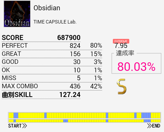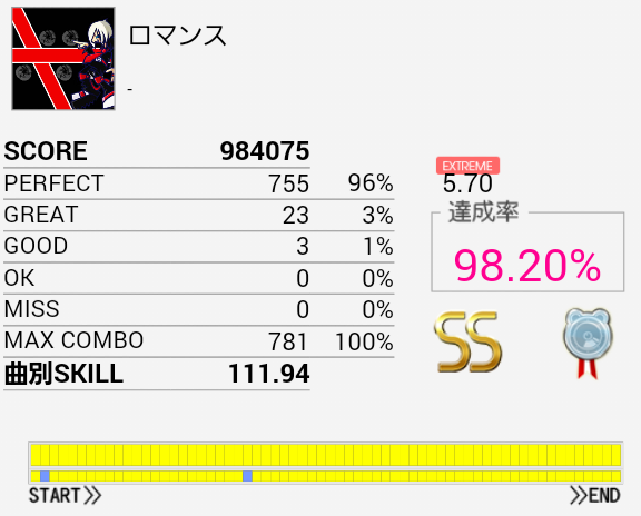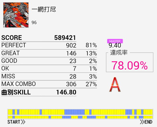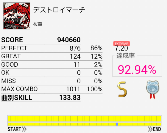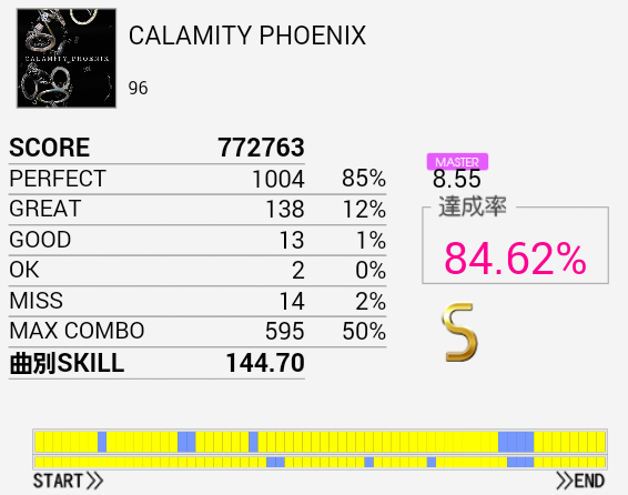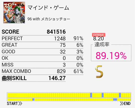 三連符部分がハマって微伸び。やっぱり気持ち遅めだ。最近あまりプレイしていないけれどラストまで繋げられれば150は余裕で付くだろうしこれもやらなきゃなあ。