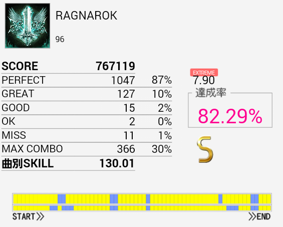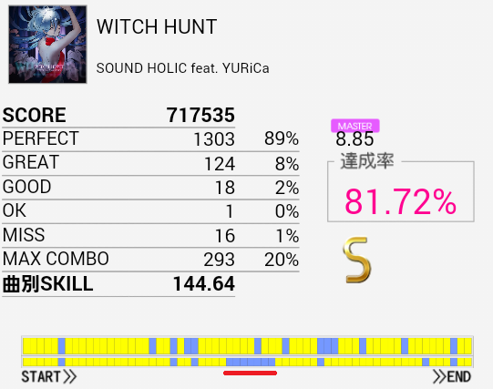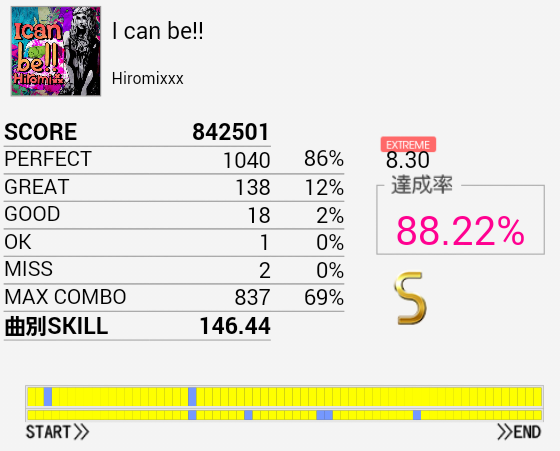 S取得。今日一番うれしいリザルト。赤い線の部分がサビのツーバス部分でずいぶんマシになっているのがわかると思う。パフェ率は85%→89%でこれはツーバス分だろうな。手の方をかなり忘れていたのでもうちょい伸びる、というか詰まったLT部分以外は繋がなくちゃ。