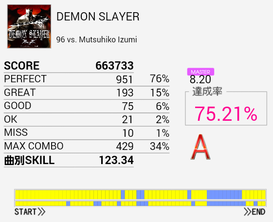 スクショ撮り忘れた。S取得。クリアメーターはたぶん今回のものじゃないなこれ。最初のツーバスをかなり合わせられたけれどタム回しは全滅だった。とにかくタムからSNに戻れない。ツーバスが合えばその後のモチベーションも上がるので練習したい。