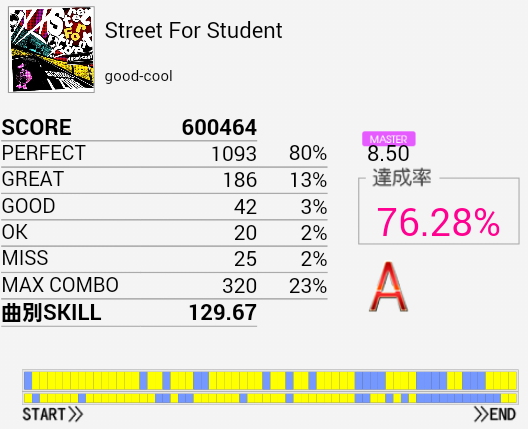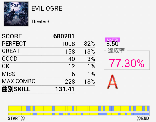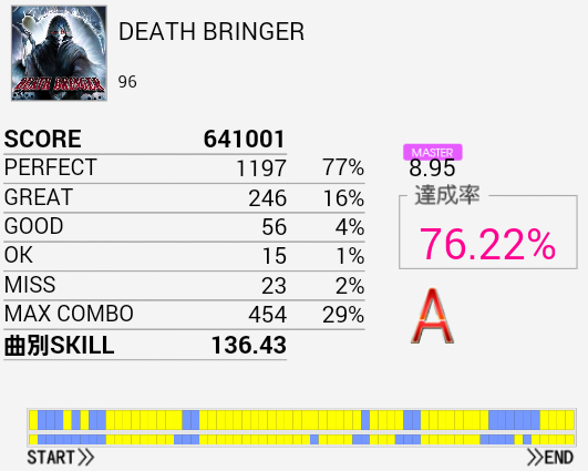 B判定→A判定。連バスで来るパターンがまったく処理できない。この曲もライバルがあまり手を付けていないみたいなのでせめてSは一番に取ってやりたい。