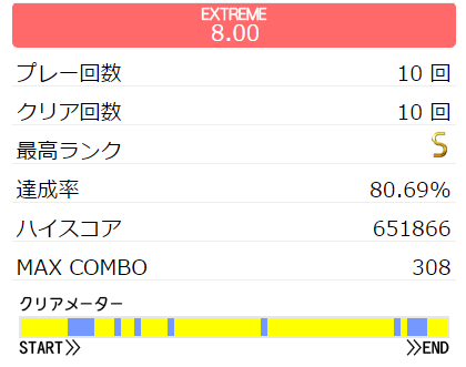 微伸び。途中で集中も体力も切れた。二回目のHH連打いつも忘れるな!でもツーバスが合わせられてフルコンが見えてきたので本格的に取り組むか。