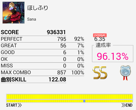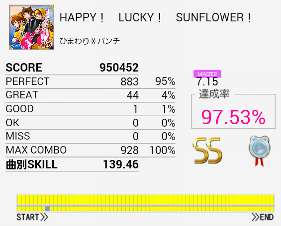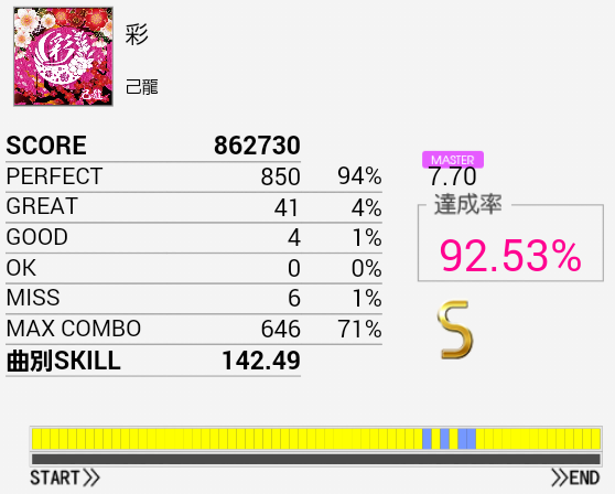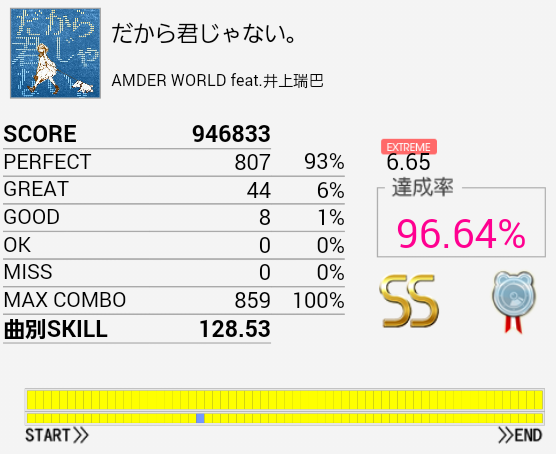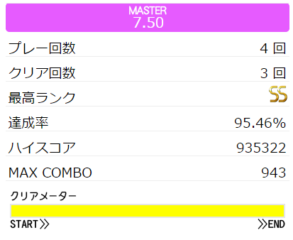 紫ネームくらいからずっとやっていたのでかなり嬉しい。この曲のおかげでHT→LTの追い越しをできるようになったなあ。後半緊張してGOOD連発して焦る。