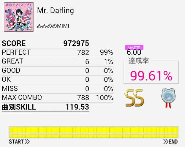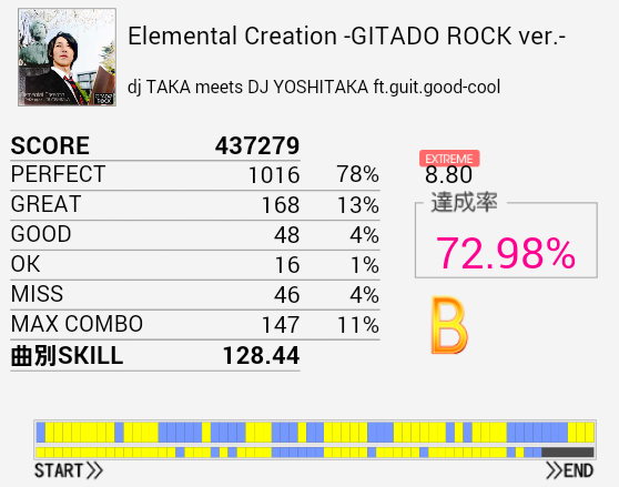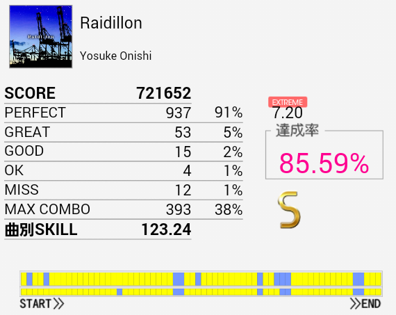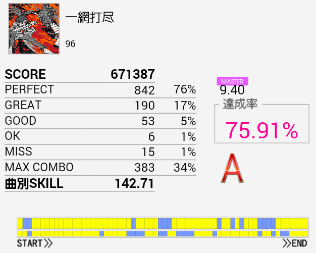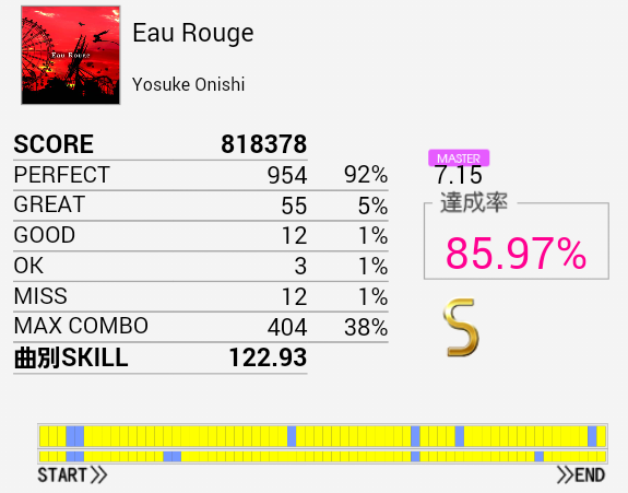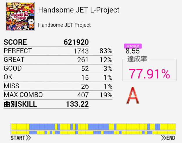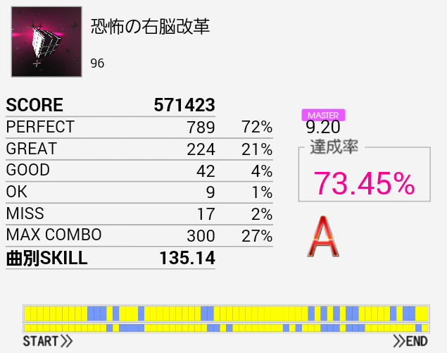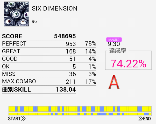 伸びそう(大嘘)久しぶりにA判定取れた。最初の部分のBPが何気にキツいんだよな。自分だけかな。手もクロスして引っかかったりSN×2→HT×2→LT→FTからの同時とか。というか全体的にキツいっす。