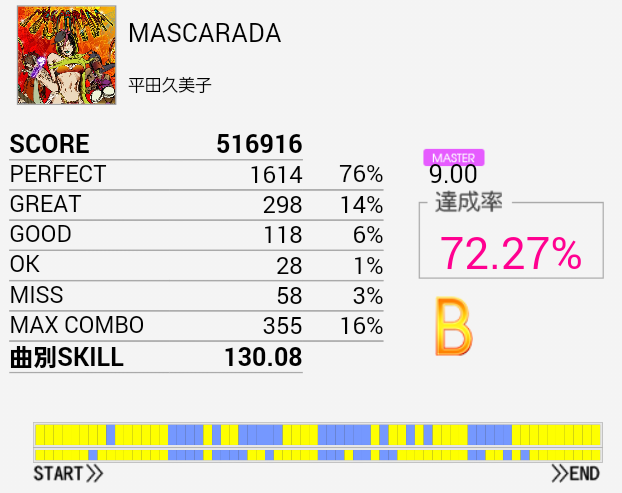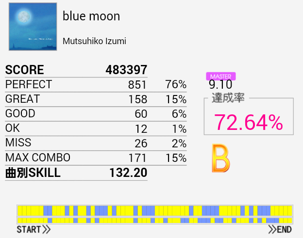 この曲も最近やっていなかったなあ。中盤LP部分のSNが増えたせいですごく難しい。でもA判定でスキル138ってのを見ると対象入りあるんじゃね?って思っちゃう。