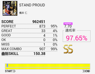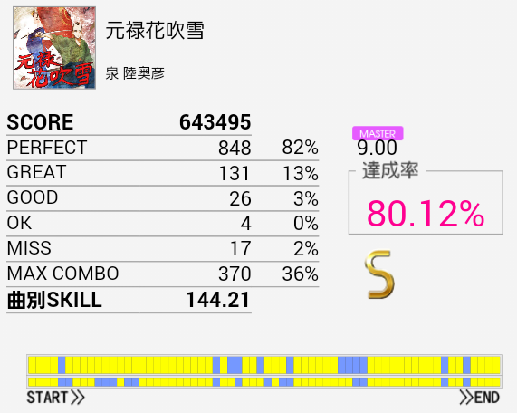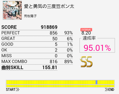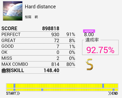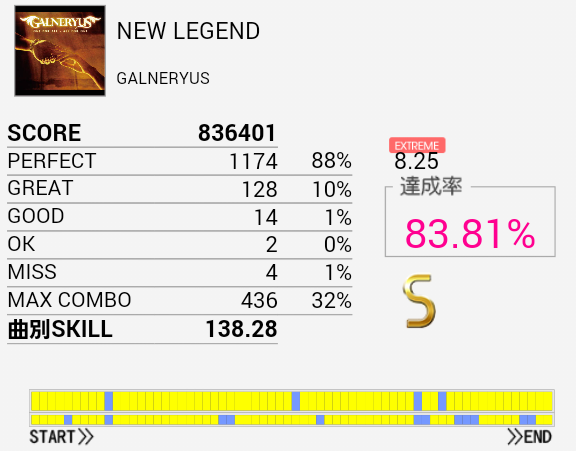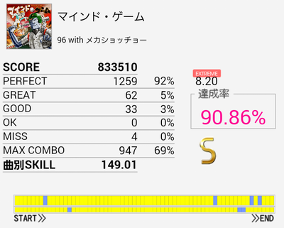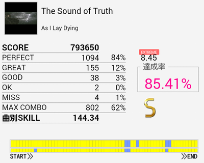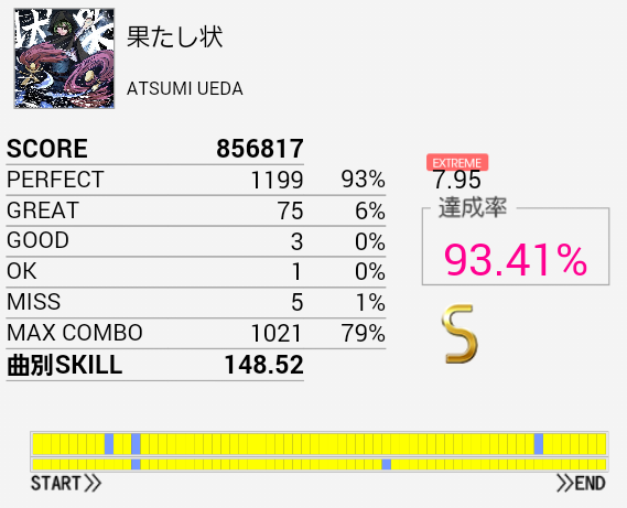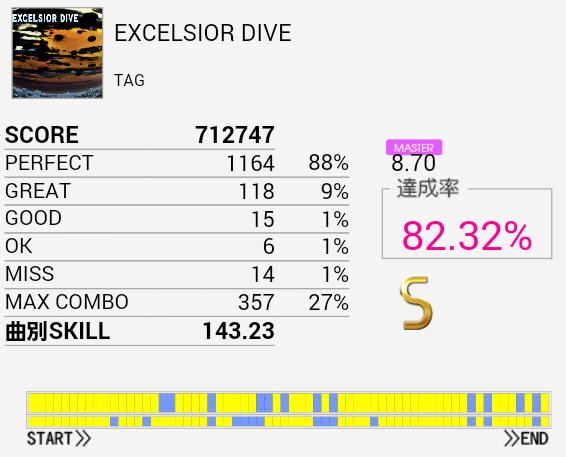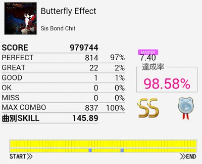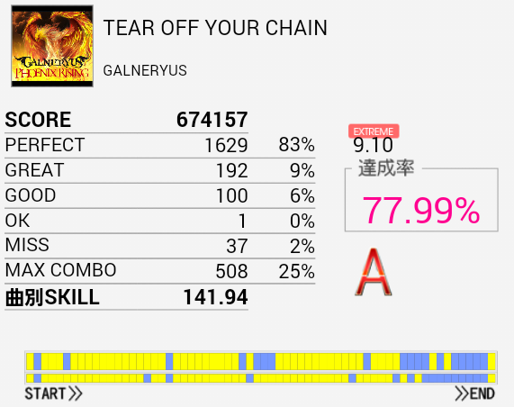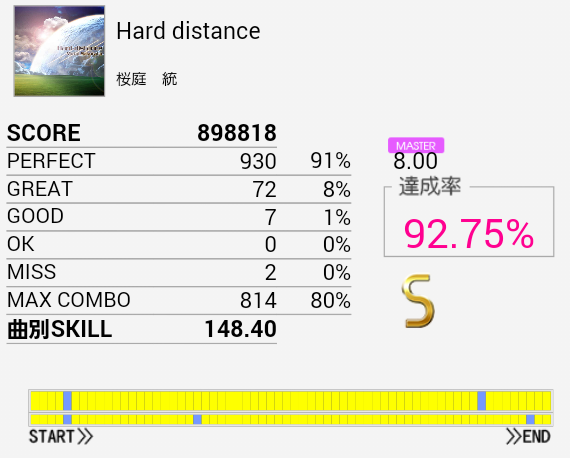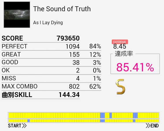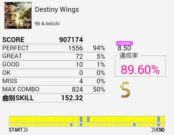 結局この曲に頼ってしまった。解禁二回目でだらしないパフェ率で繋がったまま放置していたのを繋ぎ直し。なかなかいい集中力でプレイできたと思う。