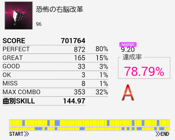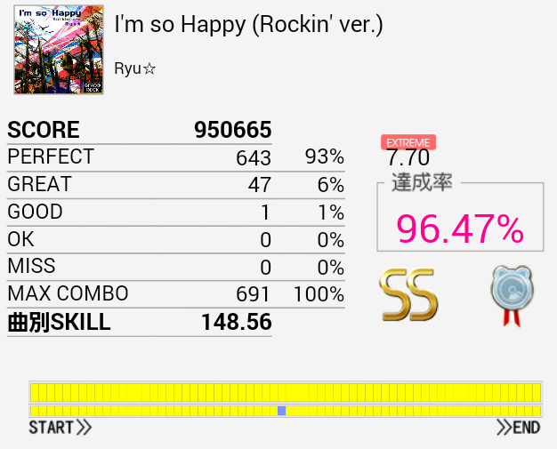 今日一番びっくりしたリザルト。パフェ率もそこそこだし、何よりクライマックスのCY→タム×3→LCが「ハマった」感じがした。ミスってるけれど。CY→タム×3→LCじゃなくてCY→タム→タム×2→LCって感じに体の動きを意識するとよかった、のだろうか。もう一回やったら絶対できなくなってるだろ。