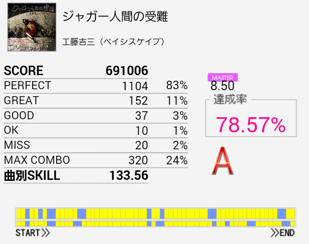 これも結構びっくりしたリザルト。A判定からこんなに伸びるとは。真ん中のMISS二つはタムをスカったやつなのでそこが繋がっていたらと思うと。ラストのツーバスは左足が追い付かなくなる。