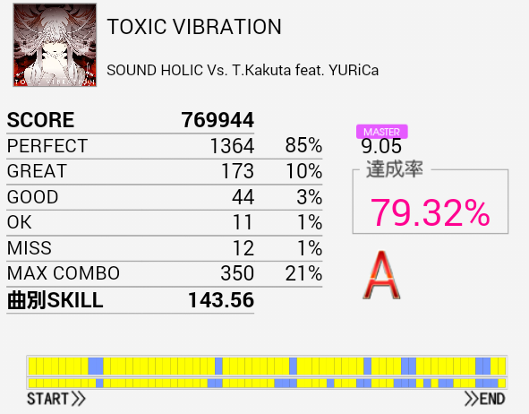 やーっと繋がった。パフェ率低めだけれど致し方なし。一番の難所がイントロなので繋がるとその後テンパって凡ミス連発していた。