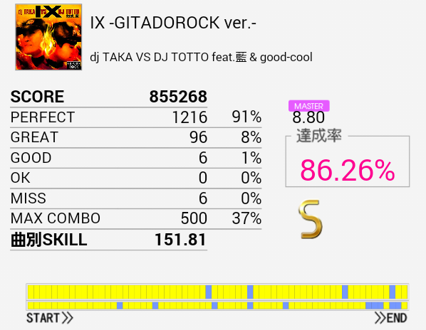 先日書いたタム回しの入りの方を確実に叩くよう意識したらあっさり繋がった。テンパってCY刻み部分でGOODまでズレた以外は満足。150に乗らないあたりまだまだ何かしらの壁を感じる。