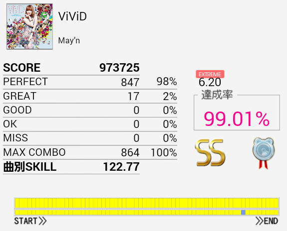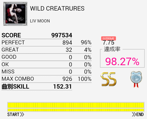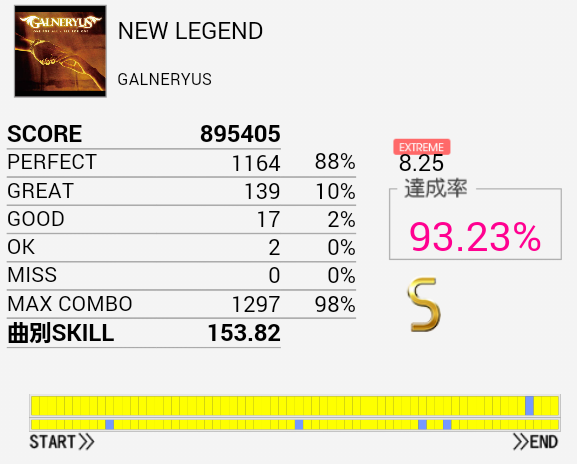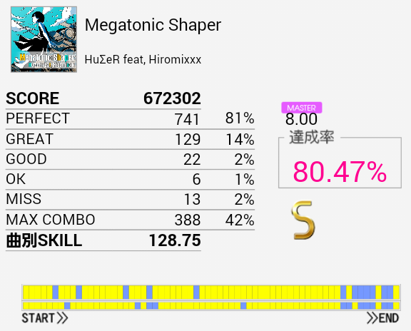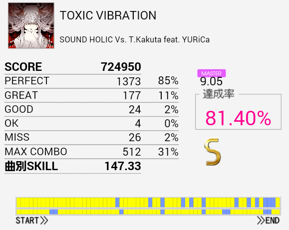 1クレまるまるやってなんとかS取得。初見は76.93%だった。難しいリズムで振り回されるし三連タムも頻出して、ラストは認識が追い付かない。サビらへんを繋げばなんとかSは出る。それ以上は知らん。たぶんHHは左手で叩く曲なのだろうな。