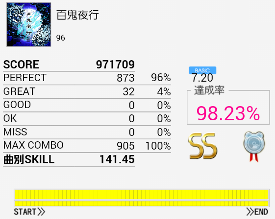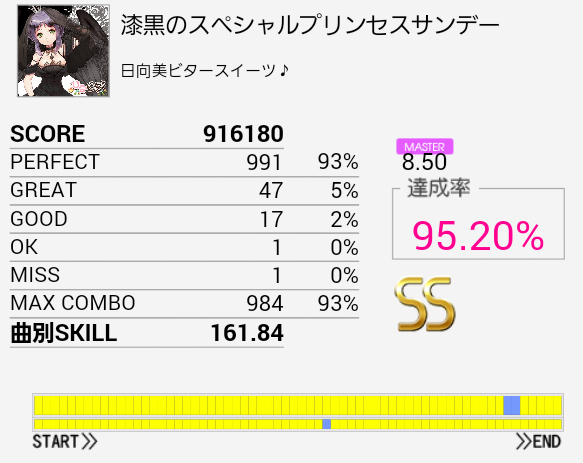 自分にしてはなかなかなパフェ率だったので記念撮影。やっぱり主に足でGREATが出るよな。しかられ日和はフルコンできません。