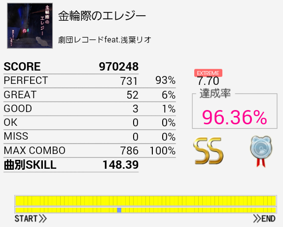 ジャケ当てで久々に選曲したらなんか繋がった。プレイ中はパフェ率80%台かと思っていたけれどそこまででもなかった。もう対象に入れられないのだよなあ。