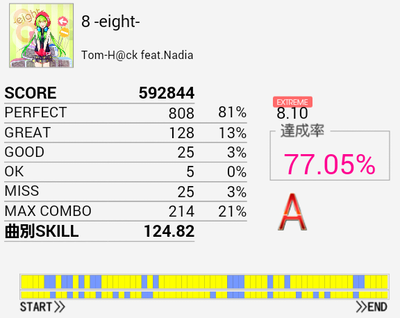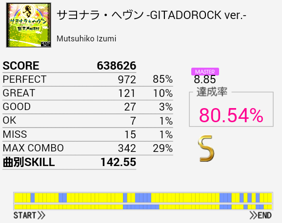 8分BP部分がちょっと怪しかったけれどなんとか繋がった。ちょくちょくプレイしていたので嬉しい。この曲MAS譜面欲しいよな。