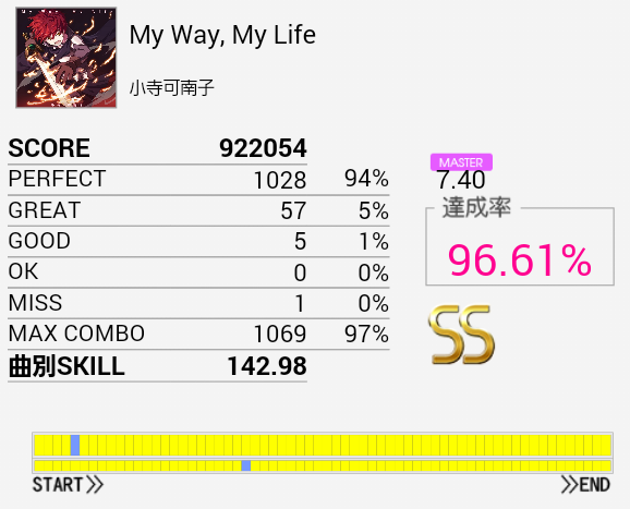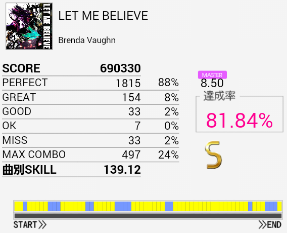 いつもの泉さん譜面。単純な部分が長いのでSは取れたけれどフィルと奇数タム、逆タムを全部繋ぐのは相当辛そう。EXTが若干詐称っぽかった。