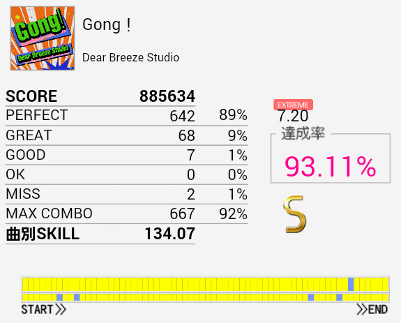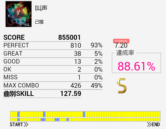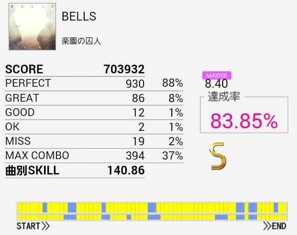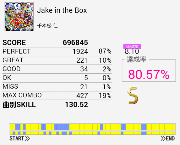 A判定→S判定。16分三連は叩けなかったけれどその後の16分は叩けた。それより後半の交互がズレるのがマズい。