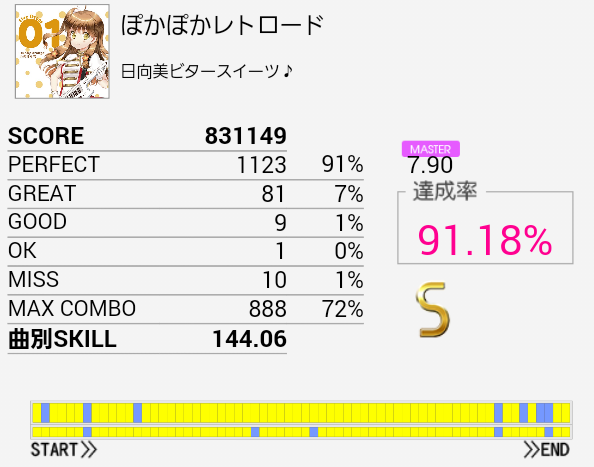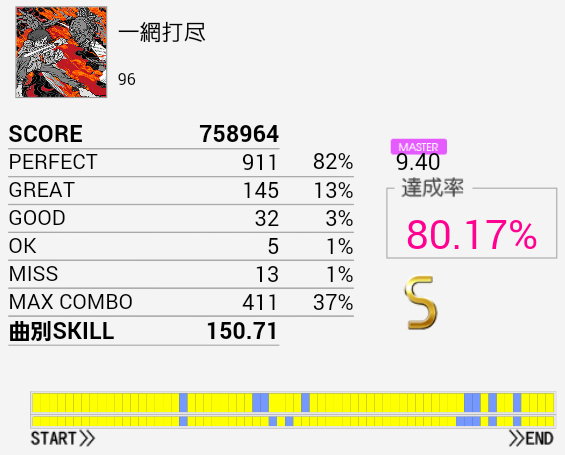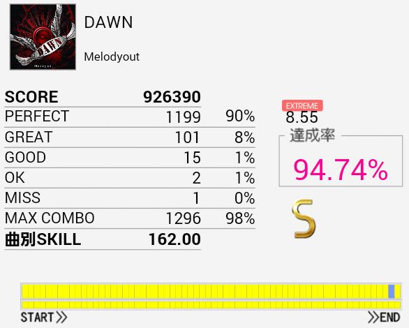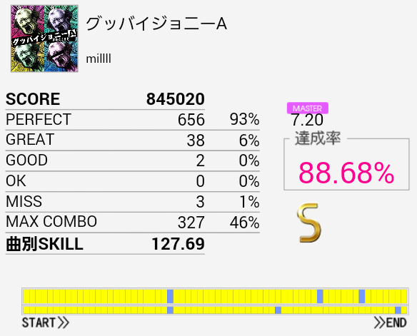 ついにS取得!パフェ率がだんだん上がってきているのだろう。一応後半の16分三連タムまでは現状で繋げられるはずなのでまだまだがんばりたい。