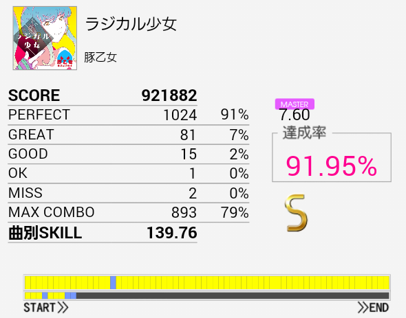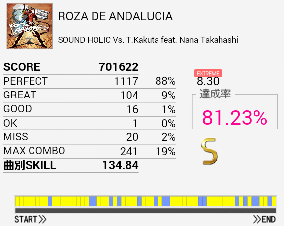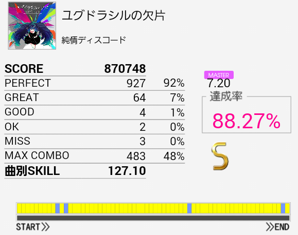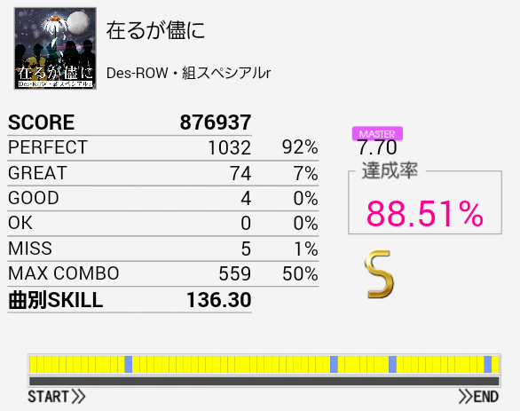 よくS取れたな。こういう譜面の抜き方だとCYからタムに変な手の動かし方をしてしまって上手く叩けない。悠久のPEGASUSも同じ。だからといってMASの通りになっていても叩けないのだけれど……金ネーム、というか銀折り返しを目指すにあたってなんとかしたい。