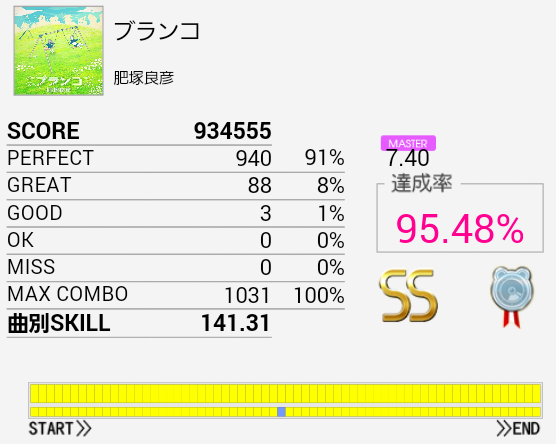 赤丸の部分、最初の階段タムが繋がった。あと最後のも最初の一回は上手く叩けた。これでSNダブルをミスってなければなあ。これシングルで回す必要あるのかなあ(素朴な疑問)。まあ何回もやって中盤もちょっとずつ上手くなっているし……。