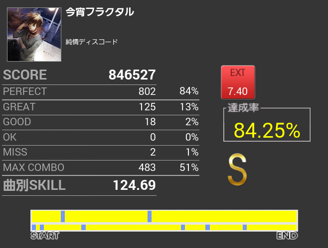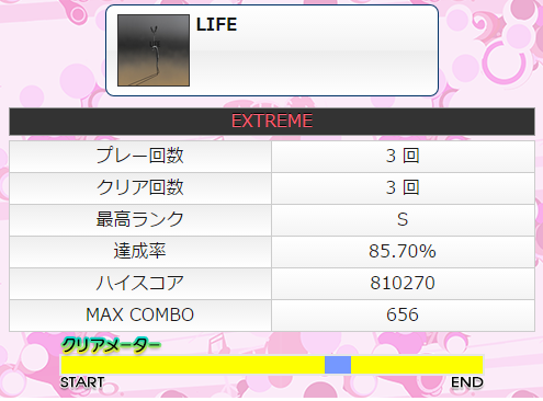 サビ前はEXTのLP4分が癖になってしまっているようで焦った。LP邪魔で譜面見えない。