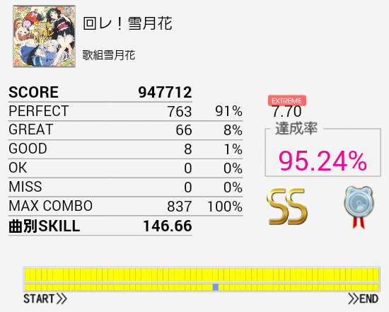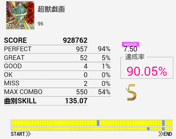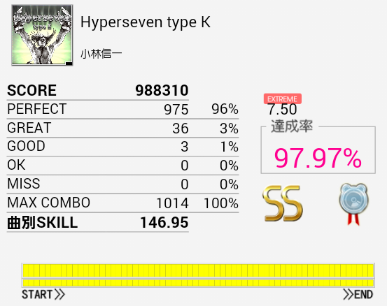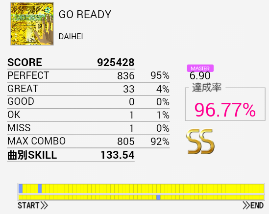 ど真ん中1ミス!デデッデデッデッデッ!!のSN×2だったか。やっぱり左手。ツーバス部分が合うようになれば他の桜庭曲より手は易しい感じなので繋ぎたいなあ。