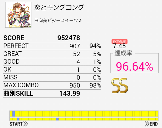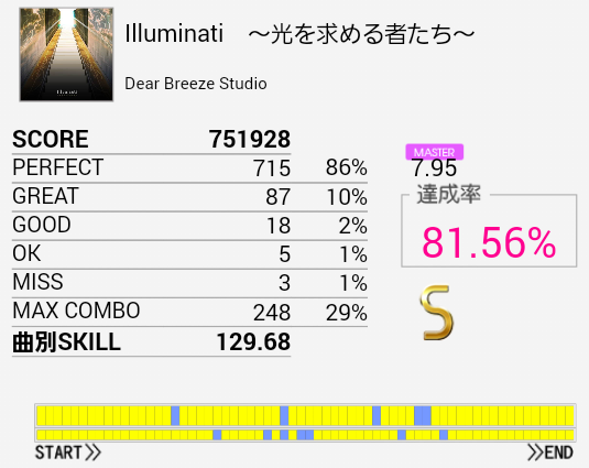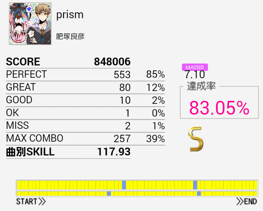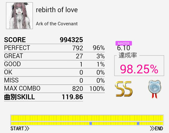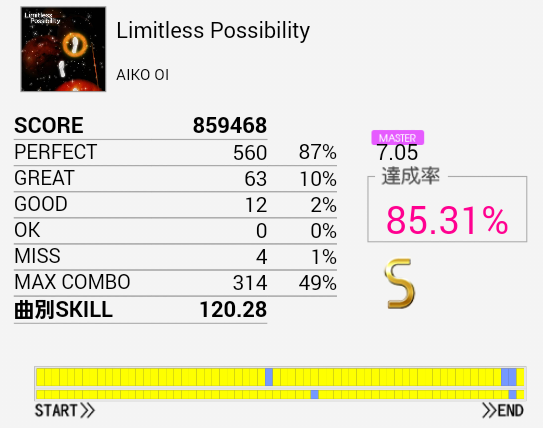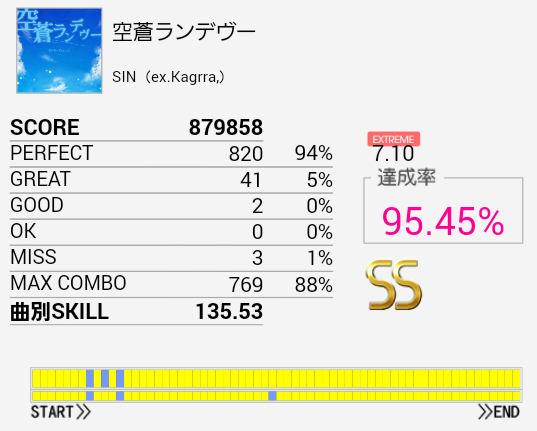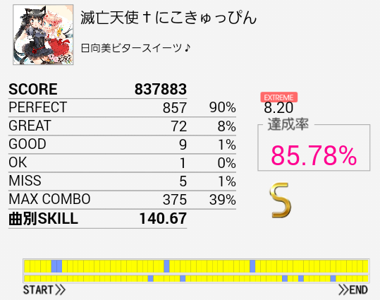 自分にとっては9.2くらいの曲。オープンの人ならサビ終わりまでは繋げられるのかな?それで達成率がどのくらいになるのかは気になるところ。