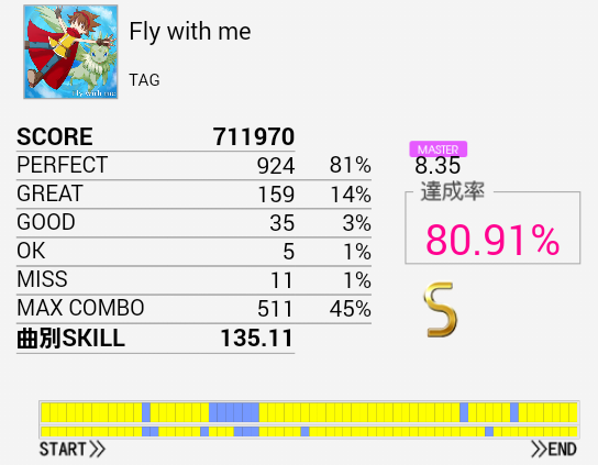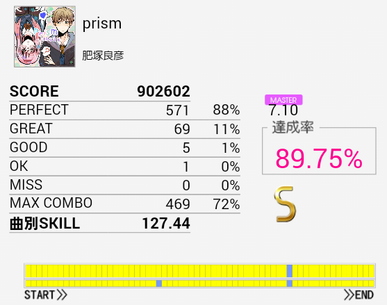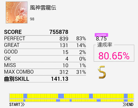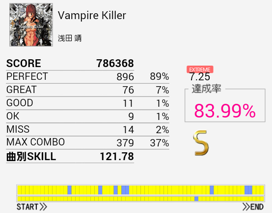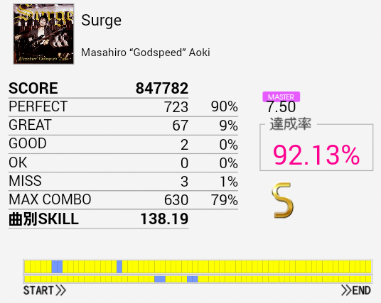 16ビート多めで覚えゲーな感じ。初見A判定だったのは内緒だ。次に来るパターンを覚えれば難しい移動なんかもないのでこの難易度なのかな。正論譜面中に来る裏入りの二連BPはちょっと苦手。イントロがよくわからなくてゴリ押していたのだけれど確認したら5/4拍子?なのな。SNは左手→右手。LC後のHH×2をダブルでもいいか。