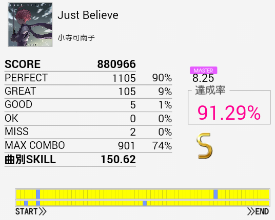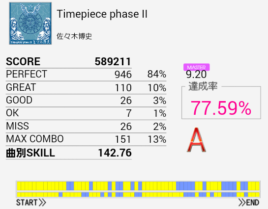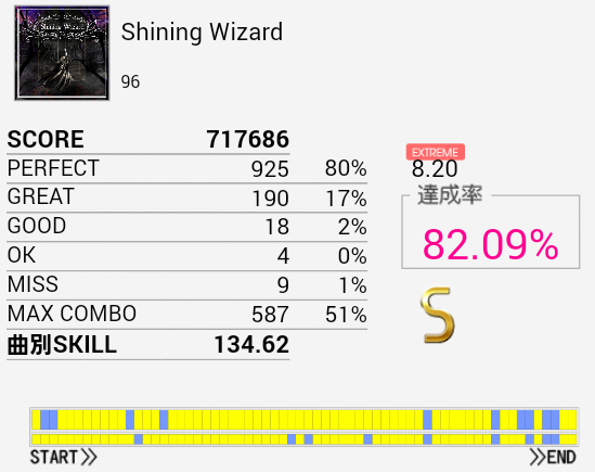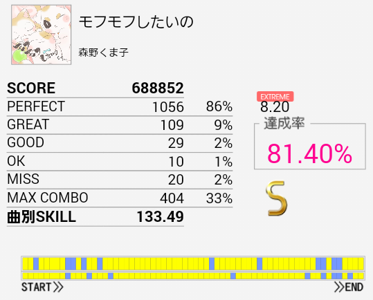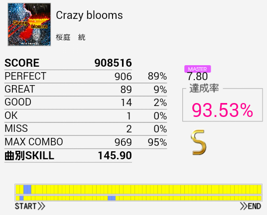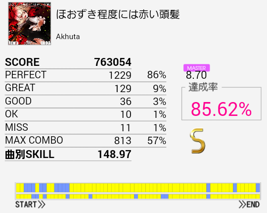 B判定→A判定。EXTより達成率出ているのですがそれは……パフェ率がとりやすいのかな。前半は割とつかめてきたので後半も改めて確認せねば。とりあえず早くEXTでSを取りたい。
