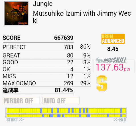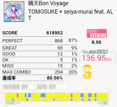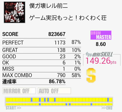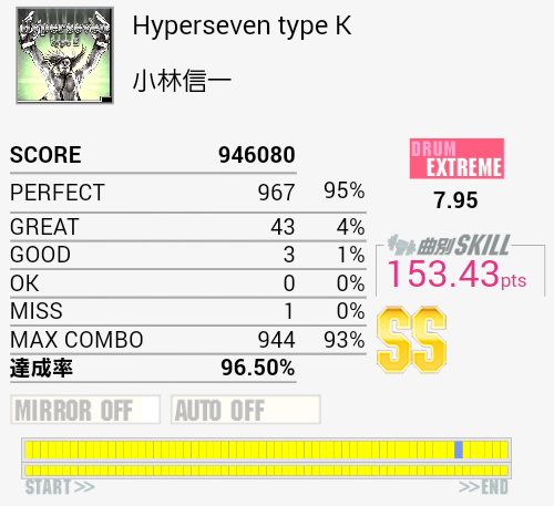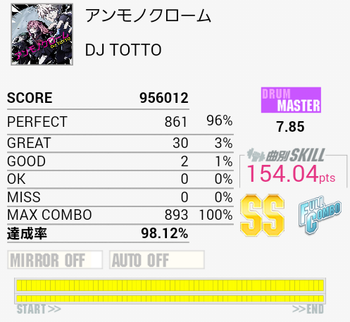 手順を間違えなければそこそこいけるのだけれど、問題は真ん中らへんのHH連打とSN連打かな。あとアウトロのキーン(他ゲーマーからの視線)。