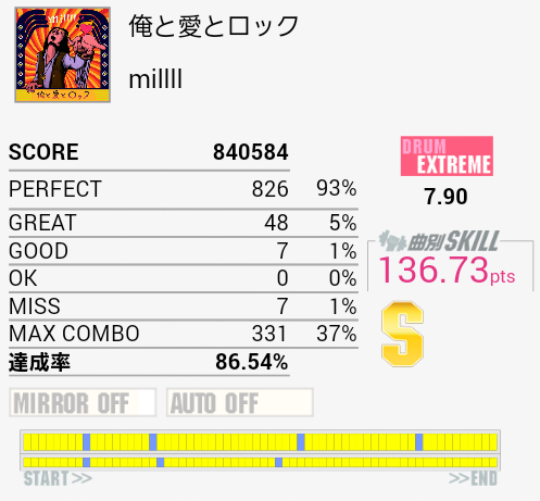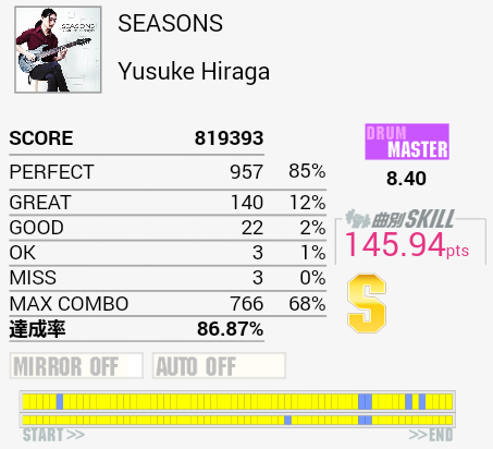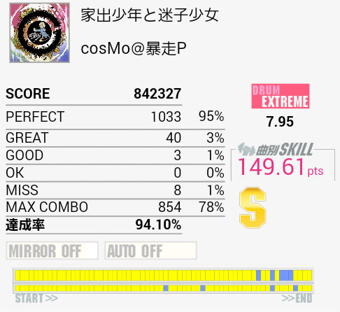 CYの多重反応がなければめちゃくちゃ伸びていた……と思ったらサビ前のSNで切ってたわ。イントロのツーバスを踏める時と踏めない時の差が激しい。
