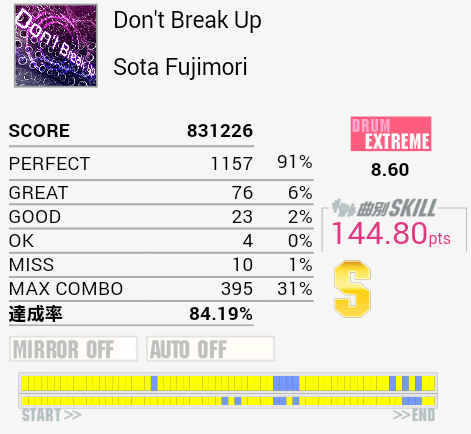 この曲8.00でもよかったと思うのだけれどな。前作の自己ベストと比較してコンボ数は全く同じ、パフェ率が2%上がって達成率+1%。「泣きそうな顔 格好悪いな」らへんまで繋げられればSS取れそうだけれども。なんで前作の自己ベストを出した時にクリアメーター更新されていないのだろう。ミス数も関係しているのだっけか。それにしてもクリアできなかった頃からしてみれば上達したよ。やっぱり覚えゲーだな。