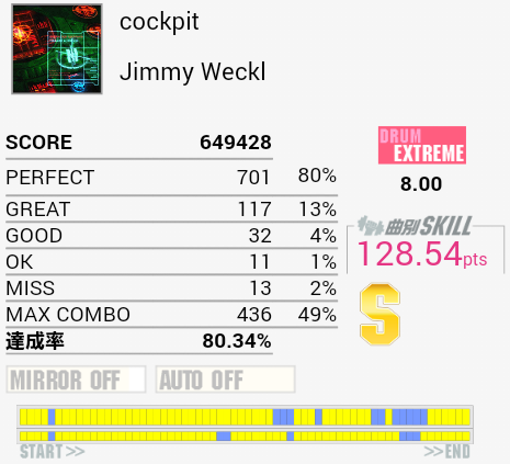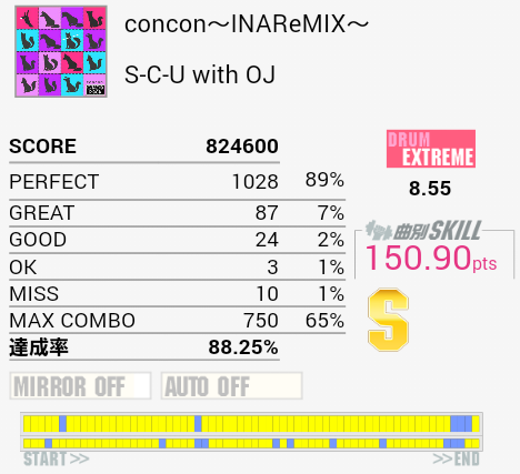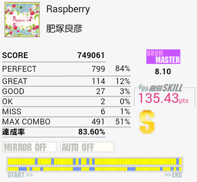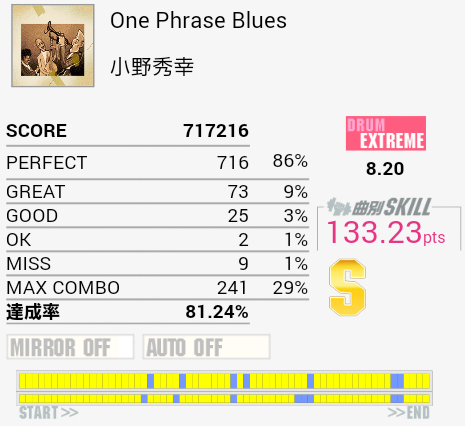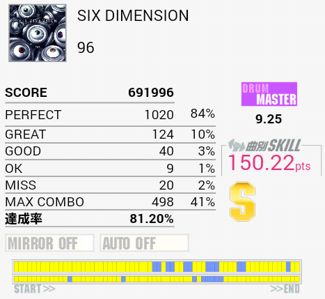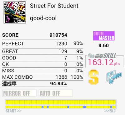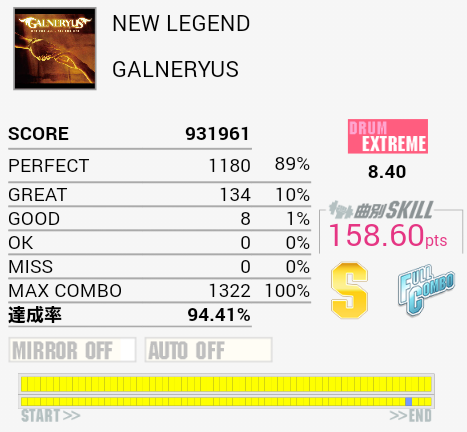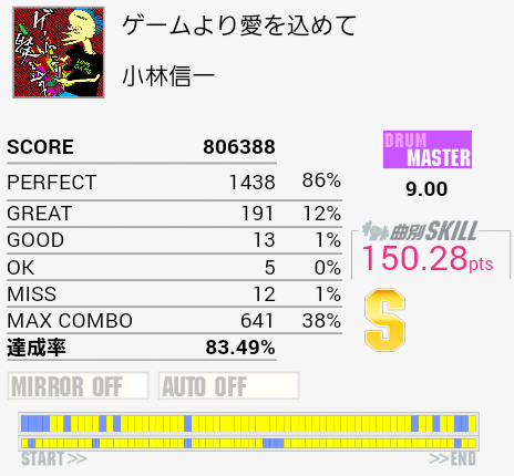繋がった。ギターソロの部分もちゃんと踏んでるよ!最後の方ズレてしまってパフェ率が落ちてしまったのが残念。