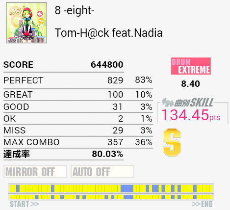 これで旧7代後半のS埋めは完了!そして現8台前半の未Sが残り2曲に。相反オポチュニティーとSnowy India (EXT)なのだけれどどちらも認識力が要求されてつらい。S取れたら上手くなっているということなのでほどほどにがんばる。
