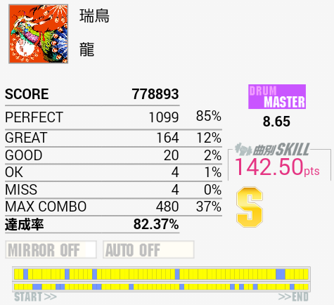 細かい連打、タムやシンバルの振り回しなどいろいろな要素が合わさって難しい。とはいってもエグい配置はないので単純に手順を把握できるかどうかって感じ?目の前で前作虹ネームっぽい人が一発でSS出していたのでそういうことだと思う。曲名の読み方は「みずどり」でいいのだろうか(曲名ソートでま行三毛猫ロックンロールの後ろ、瑞は訓読みで「みず、めでた(い)」)。瑞兆(ずいちょう)はめでたいことが起こる前兆のことで、鳥だと鶴とか鳳凰のことらしい。ジャケットの鳥は……なんだこれ?