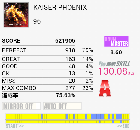 今日はライバルの方と一緒にプレイ。解禁作業をギターでやったせいで腕が疲れたのか、普段S判定判定の曲でもA判定だったりと散々だった。パッドの位置とかしっかり認識して微調整できるようにならんと、ほんとにそろそろ。