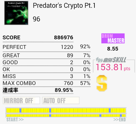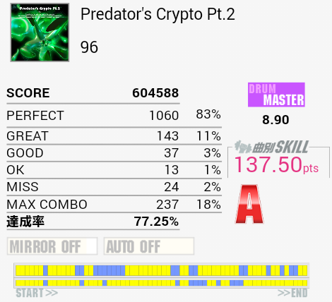 プレデターは本当にいけそうなんですけどねー。Pt.2も譜面はだいたい理解できるのに手が追い付かない感じで、単純に実力不足を感じさせてくれますね。幻想雷神記というか98曲は96の基礎的な譜面に王子の独特な成分が混ざってキツいですね。こういう苦手な曲に触っていくことが巡ってスキルに結び付くのではと信じています。