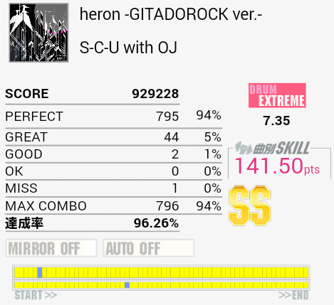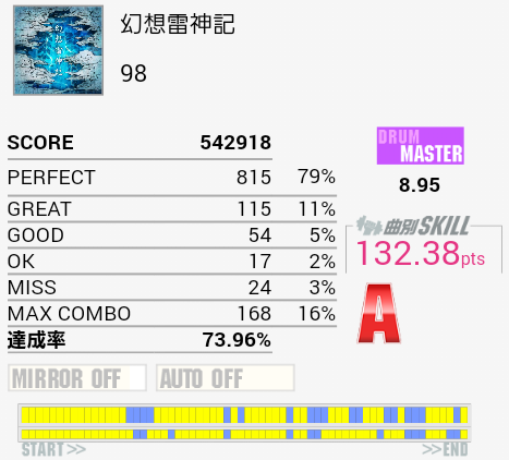 毎回少しずつ伸ばしてようやく対象の一番下に。HH→HT×4が三回とも決まればって感じ。後半のシンバルとタムの振り回し?もHHの付け根を叩いてしまったり安定はしない。