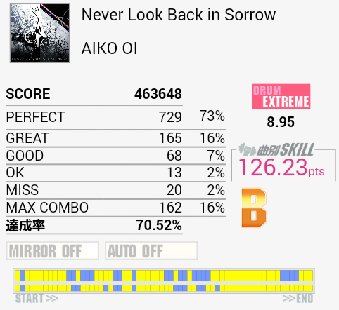 SS取得。毎回どこかしら切る。王子譜面の中では変な形もないので叩きやすいのだけれど。