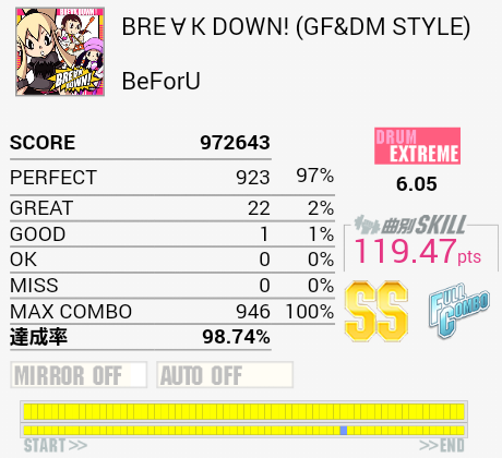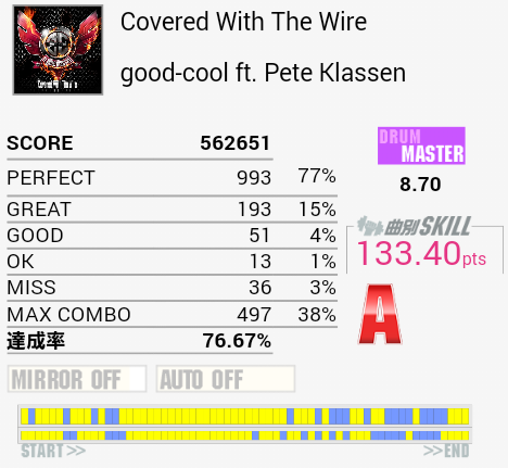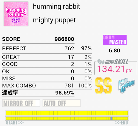 よかった、フルコンできた(三回目の挑戦)。HT×2→LT×2→FTとか全然自信を持って叩けていないので、フルコン安定にしないとダメだなあ。銀ネーム(笑)