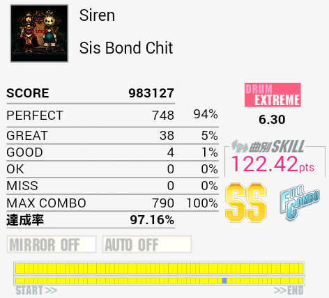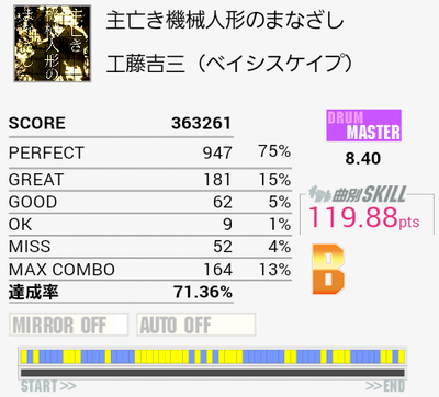 譜面を見たときはいけるかなと思ったけれどぜんぜんできなかった。まずイントロアウトロのダブルできんし……バスも変拍子なのも相まってズレる。プレイが久しぶりで譜面が全然見えなかったのでまだ本気出してないってことで(たぶん次もB判定)。