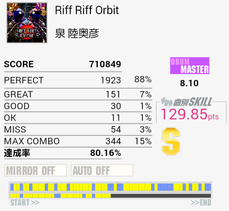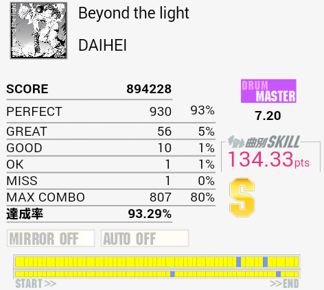 SN→HT→LT→HH(CY)が連続して来る部分で落ちかけました(小声)曲に思い入れも何もないので詐称ないつもの泉さん譜面としか感じないなあ。スキル基準ならLong曲は通常曲より甘めに難度値を付けてほしいものだけれど。