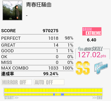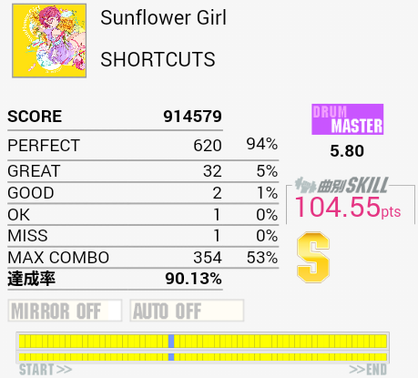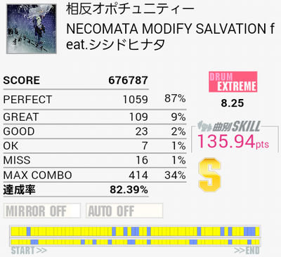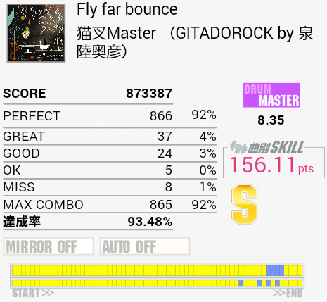 泉さんにしては道中易しい……と思ったらラストでやってくれたな!パフェ率上げればSS取れるだろうか。ちなみにEXTでもそのまんま残っていたのでスタッフ的にはここが8.35要素ではない模様。そういえば曲名じゃなくてアーティスト名に「GITADOROCK」って入るようになったのかな。その辺統一感ないよな。コンポーザーの気分とかなのかな。