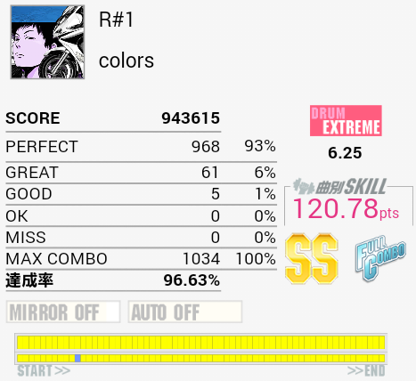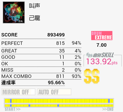 フルコン。真ん中の16分SN連打+HHがなぜか繋がってくれた。