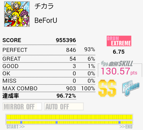 前半の刻み終わりから16分SNに入る部分は相変わらず覚えられていない。あと16分連打でリズムキープができないのとLT打ち損じが多い。