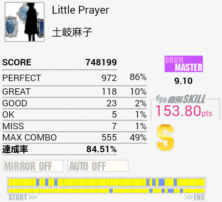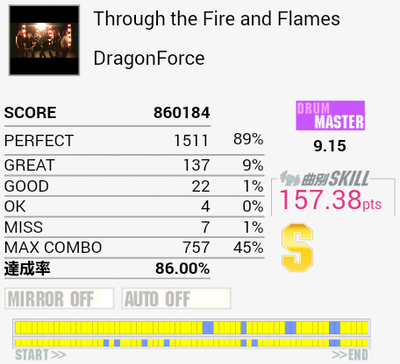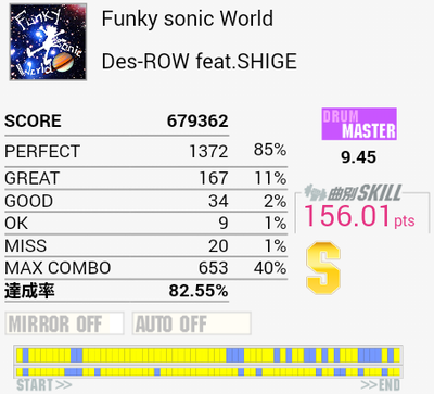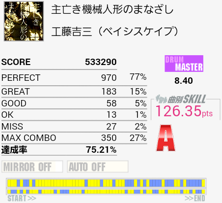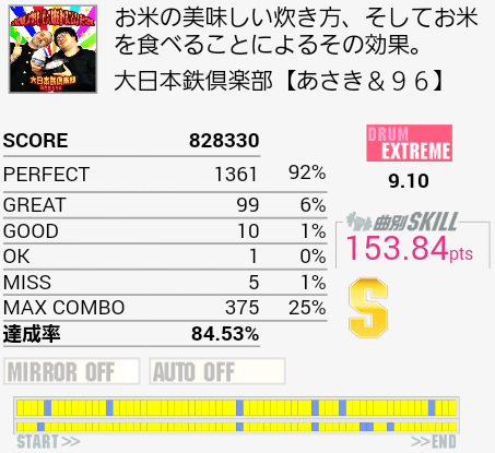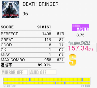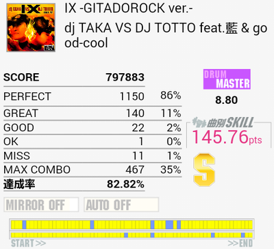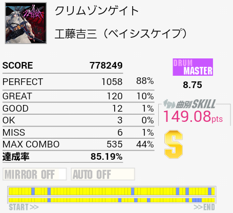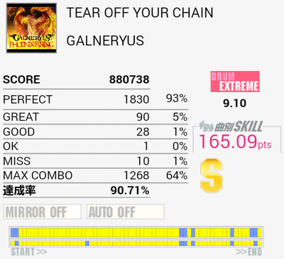 今作初Sで自己ベスト。後半疲れて間奏部分でもミスしまくったり。これ以上は前半と真ん中のタムを繋がないとなのでちょっと厳しい。