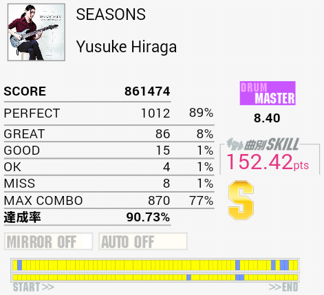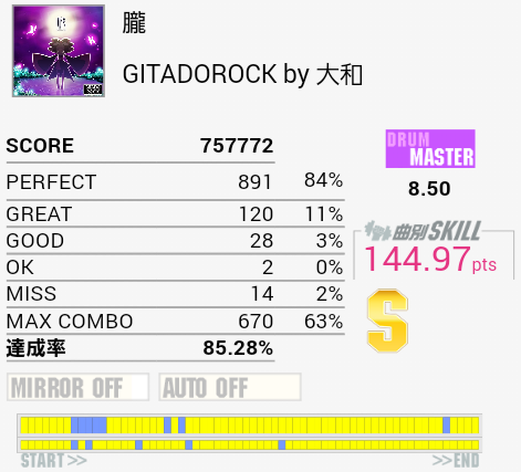 Twitterに載っていた画像によると「タイミング判定85%+MAXCOMBO5%+フレーズコンボ成功率10%」という計算になるらしく、フレーズの割り方によってはObsidianのEXTで最後のdkdkだけ切ったらSS出ない……というのがありえるんじゃないか、ということらしい。結局フレーズがいくつに分割されているかとか、曲の展開で分けるのかフィルとそれ以外とかなのか、によるのでロケテ組の報告を待つよりないな。さすがに機械的に分割してフィルの途中で別フレーズです、なんてことにはならないと思うけれど。