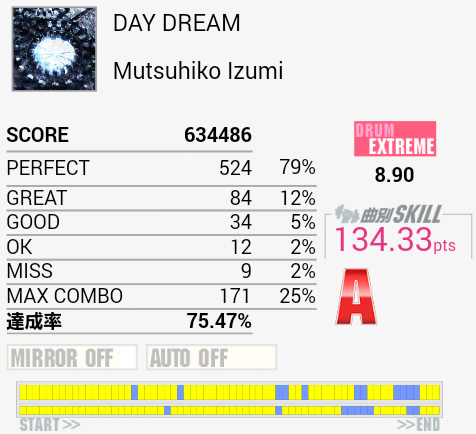 昨日(13日)はGAME PIA川崎モアーズ店とロケテでおなじみのシルクハット川崎ダイス店で、ライバルの方2人+1人で10:30~19:30までひたすら叩いてきた。途中からほとんどランダムで遊んだりしていたのでスキルは1mmくらいしか伸びなかったけれど、徹夜で行った(横になっても眠れなかった)わりにそんなにスコアは変わらなかった気がする。普段から寝ボケている可能性……?