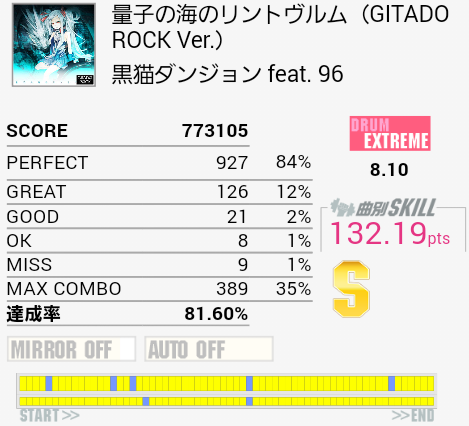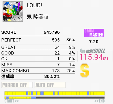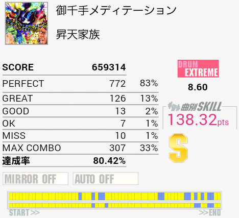 S取得!パフェ率がマシだったおかげか。序盤とかのLTが来ない部分はクロスで叩いた方がいいかな。いまだにLT→SN→SNで左手も一緒に連打しちゃう。