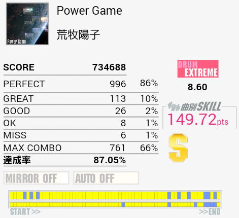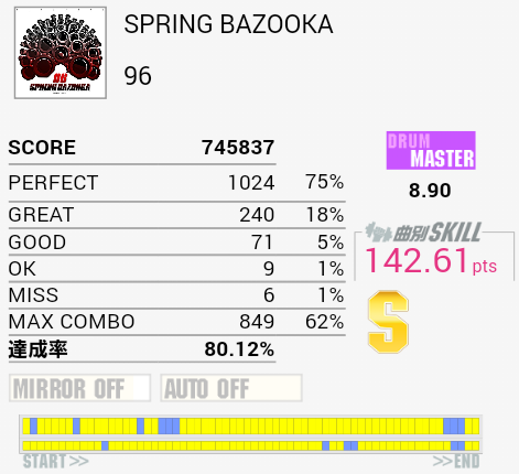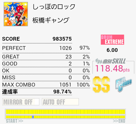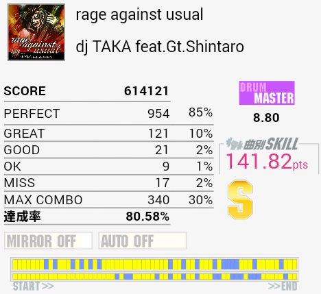 無理のある譜面だと思ったら初期の曲か。初回プレイでスティックを落とした時点でやる気がなくなった。HH→HT→LT→FT→SNをRLRRLで取ろうとするとHHが抜けたりタムを叩けなかったりスティックを落としたり。スキルには絡まないけれどこれで放置するのもよくない気はするなあ。
