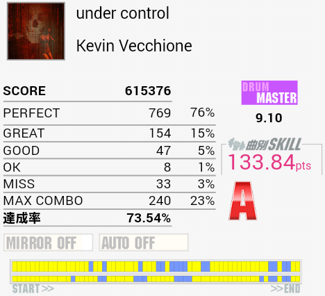 アンコール確定三曲目の9台ランダムで出てきた。こういうので稼げればなあ。HH刻みからHTに上手く移れん。SN or HH→HTの移動をモノにできれば多少手がマシになりそうなのになあ。
