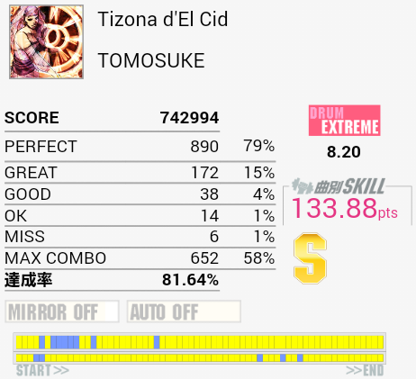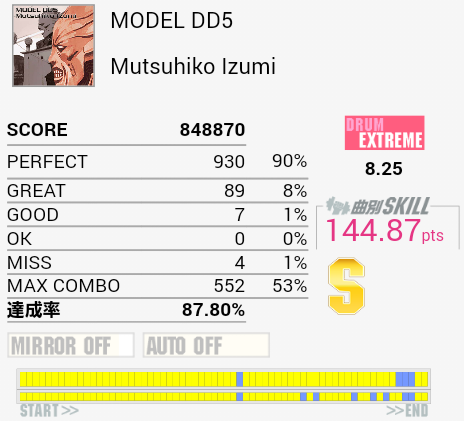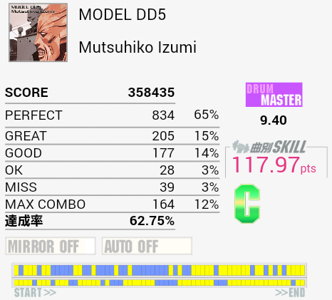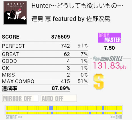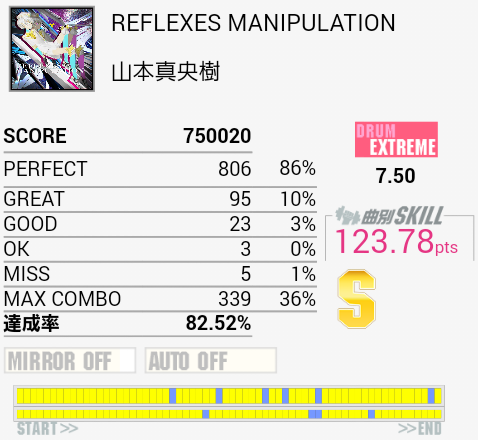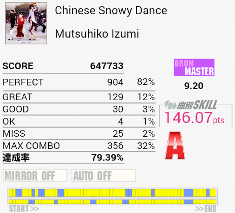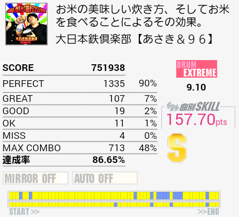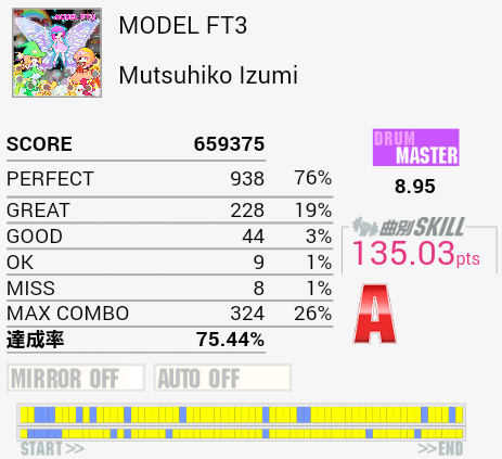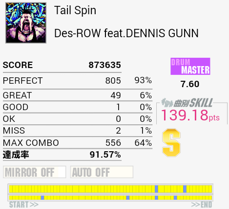 10回くらいやったけれど繋がらなかった(1ミス)。真ん中らへんのLT高速連打が苦手なのと、ちょっと後のタムとSN交互がよくわかってなかったり。確認したら単純ではあるけれど全体的にリズムがよくわからん。